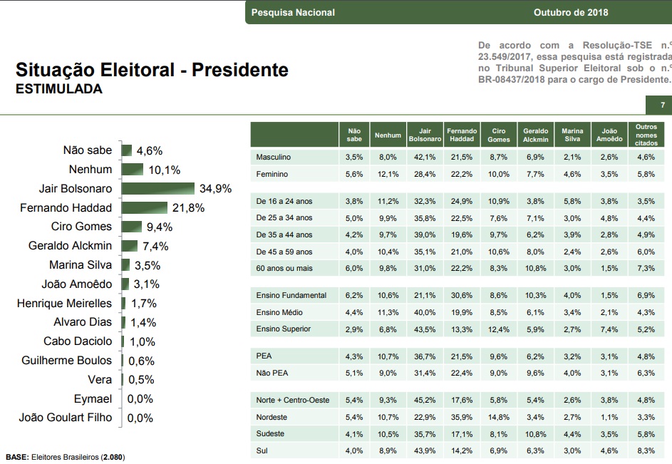 Um levantamento realizado pelo Paraná Pesquisas mostrou que o candidato à Presidência da República, Jair Bolsonaro (PSL), tem 34,9% das intenções de voto. Em setembro, Bolsonaro estava com 31,2%. Fernando Haddad aparece em segundo lugar com 21,8%. A pesquisa tem margem de erro de 2 pontos percentuais e foi feita de 2 a 4 de outubro.