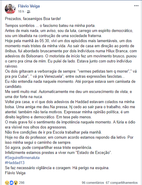 Nas redes sociais, o professor disse que “expressar a opinião política é um direito legítimo e democrático”. “Seguirei firma na luta. Se faz necessária vigilância e coragem. Há perigo na esquina”.