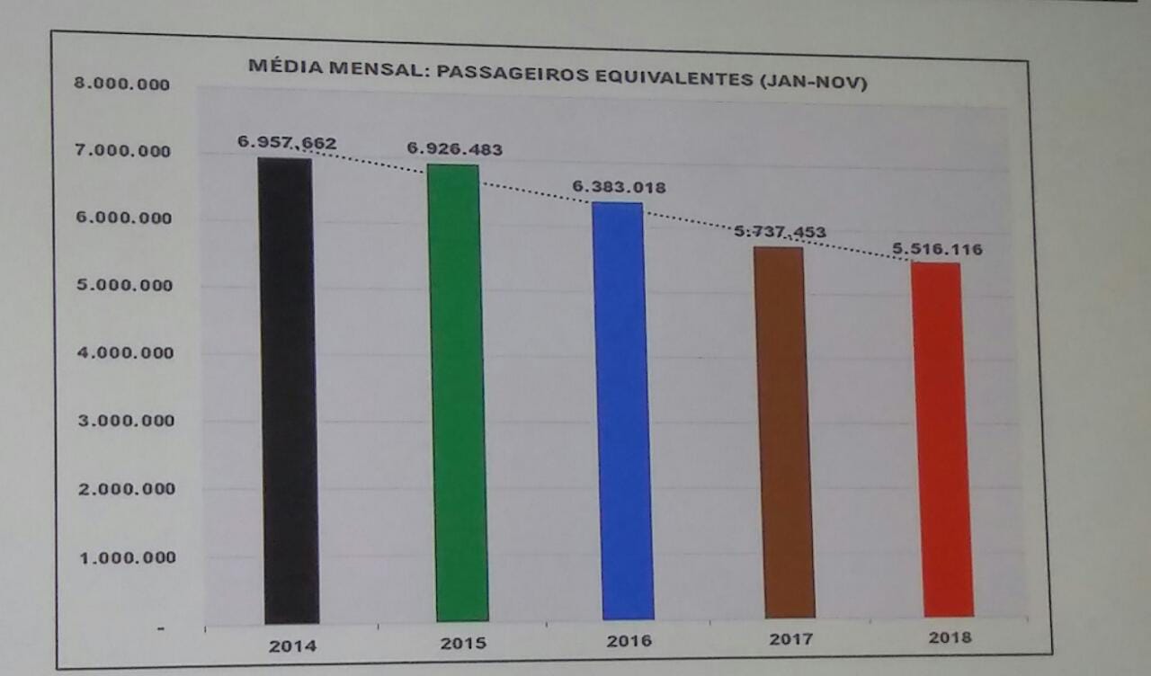 Conforme detalhou Fernando, em 2017 a média de passageiros foi de 5.737,453, já em 2018 houve uma redução de 3,8% em relação a este ano, o que representa uma média de 221 mil passageiros a menos.