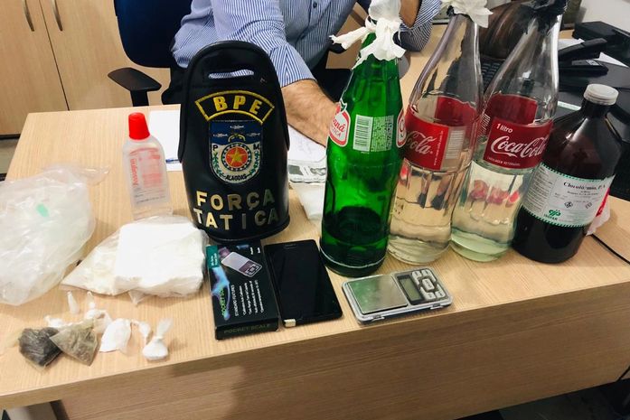 Com ele, os policiais encontraram pinos de cocaína, mas em sua residência eles encontraram uma maior quantidade. De acordo com os militares, após realizar uma busca domiciliar encontrou uma quantidade maior de cocaína em barra, bem como algumas garrafas contendo substância preparada clandestinamente baseada em clorofórmio e éter (loló).