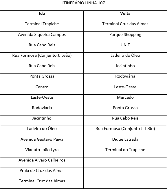 Já a linha 107 – Cruz das Almas/Trapiche terá seu terminal inicial invertido. Atualmente as viagens das linhas se iniciam em Cruz das Almas. Com a alteração, os ônibus partirão do Trapiche, passando a realizar o itinerário de forma contínua, conforme mostra a tabela abaixo.