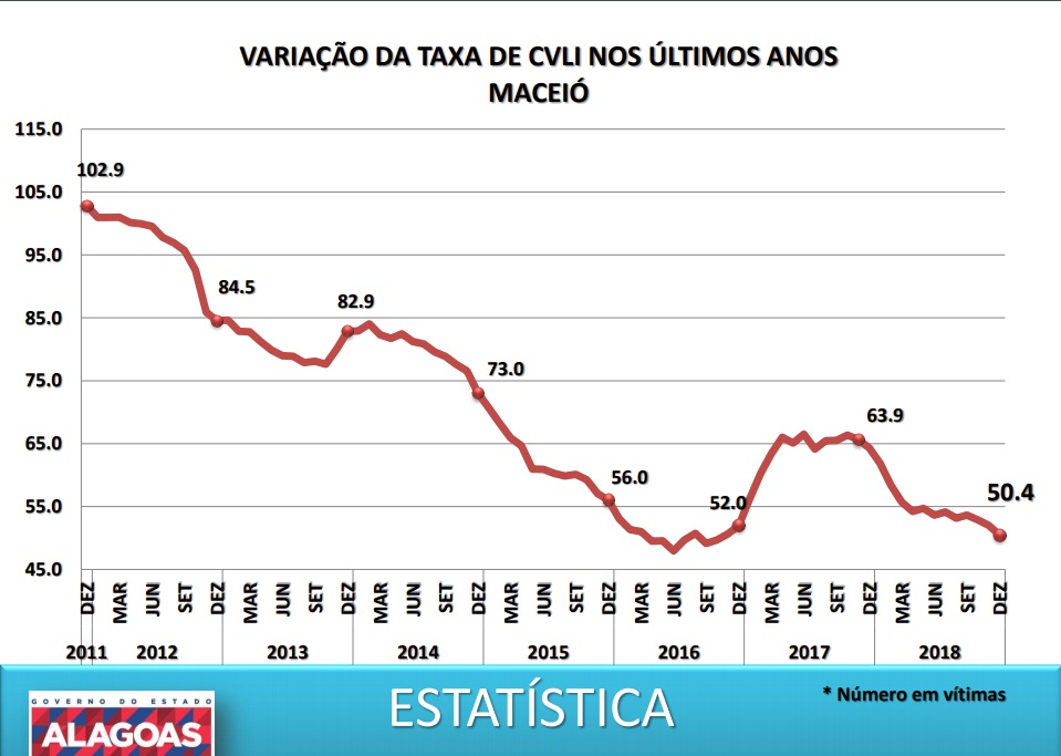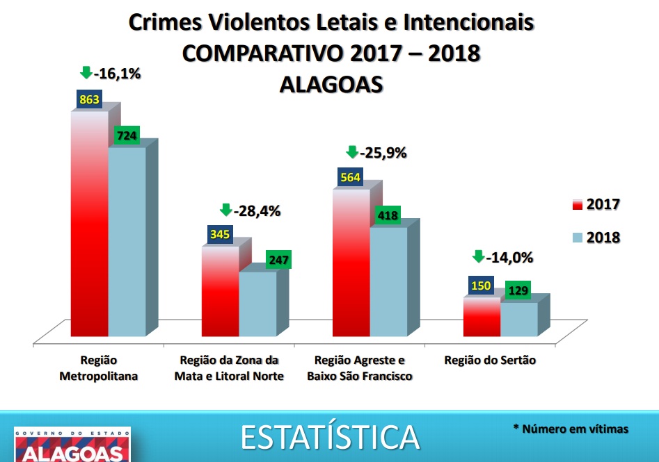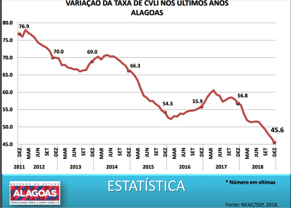 Segundo o balanço relacionado aos crimes letais e intencionais em Alagoas, de 2011 a 2014 foram registrados 9.108 mortes. De 2015 a 2018, esse número caiu para 7.130. Um total de 1.978 vidas preservadas. Em 2018, foram 1.518 crimes violentos letais e intencionais.