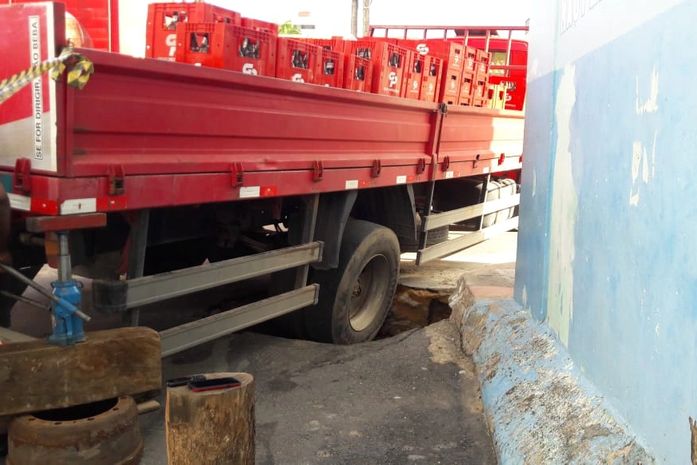 Conforme moradores do local, o caminhão trafegava pela via – localizada na área vermelha do bairro - quando o asfalto cedeu e o veículo ficou com um dos pneus preso.
