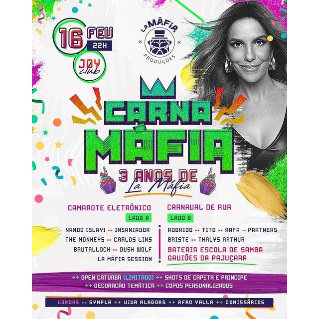 O Carnamáfia está de volta e a La Máfia está fazendo três aninhos de existência. E o que querem com isso? Fazer a melhor festa de todas! Afinal a melhor época do ano está chegando – o carnaval! Então se prepara para a prévia carnavalesca viu? São 3 anos de muita festa, bons momentos e muita história!!!