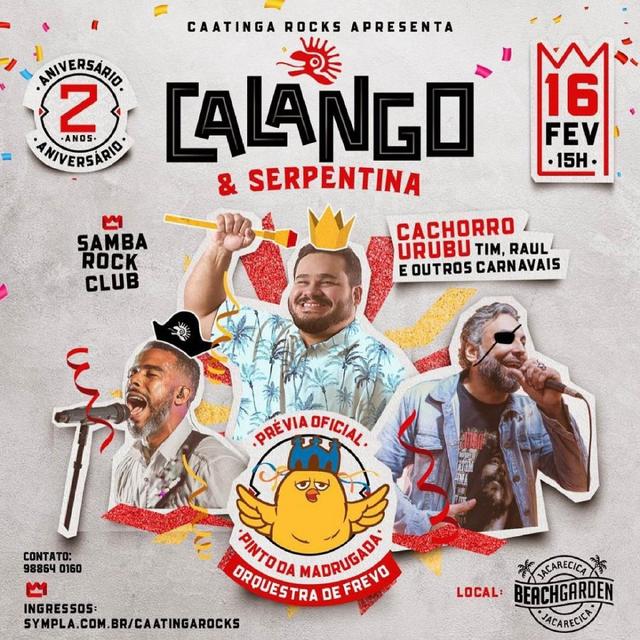 O aniversário de dois anos da Caatinga Rocks vai ser em clima de carnaval com a Prévia Oficial do Pinto da Madrugada! Orquestra de Frevo, Samba Rock Club e a Cachorro Urubu lançando um novo projeto com o melhor de Tim, Raul e outros Carnavais. Tudo isso com a melhor vista do mar de Jacarecica, comida de boteco e frevo no pé!