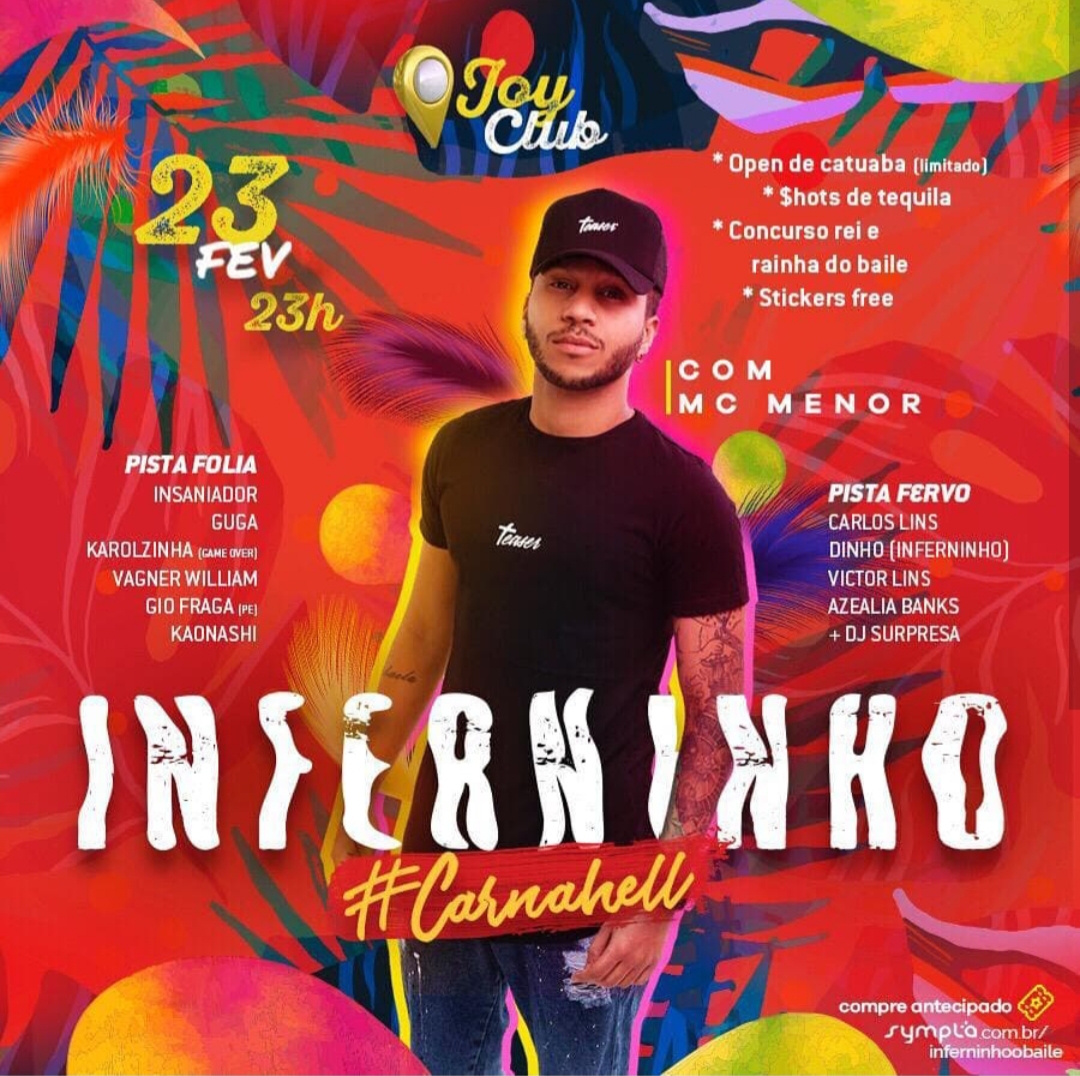 Vai ter #CARNAHELL!!! Inferninho coloca seu bloquinho na rua pela primeira vez e não está sozinho não, MC MENOR traz um showzaço para colocar ainda mais (animação) fogo no baile. A Festa irá contar ainda com open de catuaba limitado, junto com os melhores DJs da cidade.