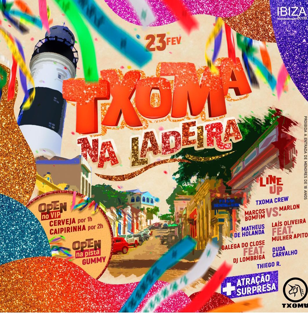 TXOMA preparamos para vocês, uma superfesta de carnaval, onde te faremos viajar para as ladeiras de Olinda sem sair do IBIZA, com decoração temática. E atendendo aos milhões de pedidos: um super OPEN BAR de CERVEJA ITAIPAVA e CAIPIRINHA no vip, além do OPEN BAR de GUMMY na pista. Muita gente bonita pra beijar muito na boca, com ATRAÇÃO SURPRESA, e um super set diversificado chegando a IVETE SANGALO, CLÁUDIA LEITE, OLODUM DA BAHIA até o BREGA FUNK DE RECIFE, E O FUNK CARIOCA.