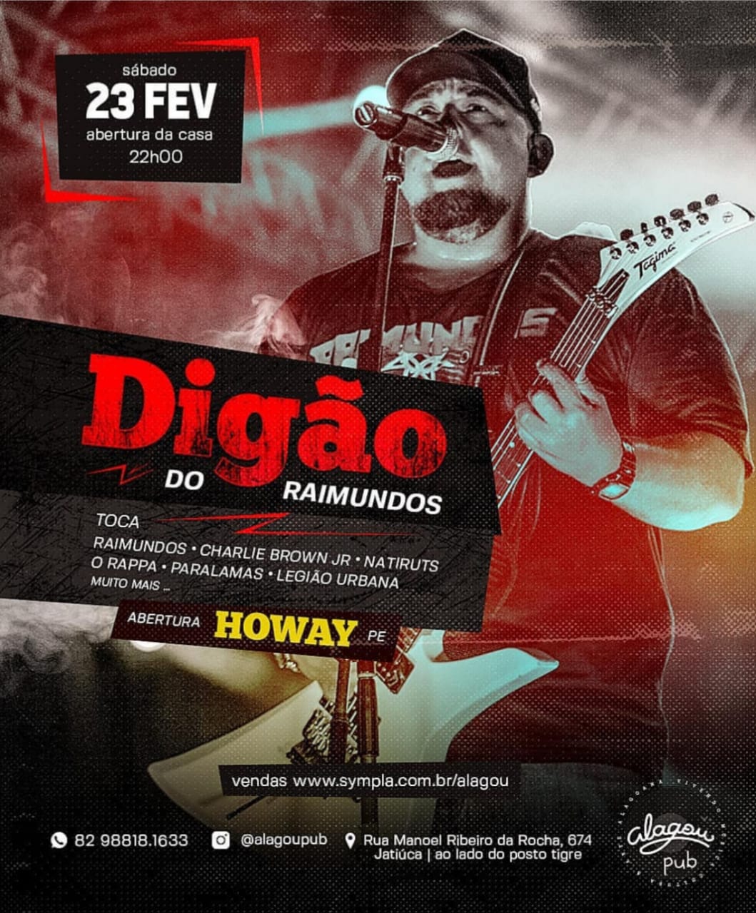 Digão do Raimundos vem para Maceió e faz parte da nossa programação de 6 anos de Alagou. No show o cantor toca Raimundos, Cbjr, Natiruts, Rappa, Paralamas, Legião e muito mais acompanhado da banda pernambucana Howay. O show será realizado na nossa casa de show Alagou Pub, local que será inaugurado no dia 09 de fevereiro e irá receber todos os meses no mínimo 8 eventos da produtora. O local do show fica localizado na Rua Manoel Ribeiro da Rocha, n 674 no bairro da Jatiuca. Ao lado do Posto Tigre.