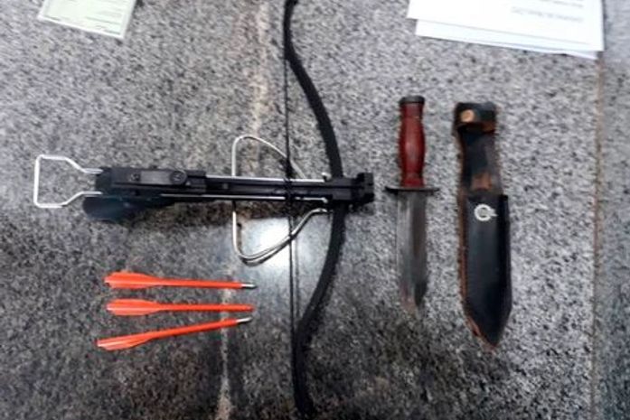 Policiais chegaram ao local e abordaram o professor. Em nota, a PM diz que o homem ofereceu resistência, mas os policiais conseguiram imobilizá-lo. Dentro da mochila dele foram encontrados uma faca Imbel, uma besta e três dardos. "O homem alegou que queria encontrar o secretário, que queria mostrar esses armamentos, depois iria cometer suicídio", informa o comunicado.