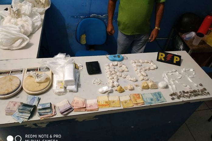 Segundo a polícia, uma equipe da Radiopatrulha foi acionada para verificar uma denúncia de tráfico de drogas em uma residência na Rua Leobino Mota, no bairro São Francisco. Ao perceber a aproximação dos militares, Fábio Junior dos Santos, que estava saindo da residência, jogou uma bolsa com drogas e dinheiro pelo muro da casa.