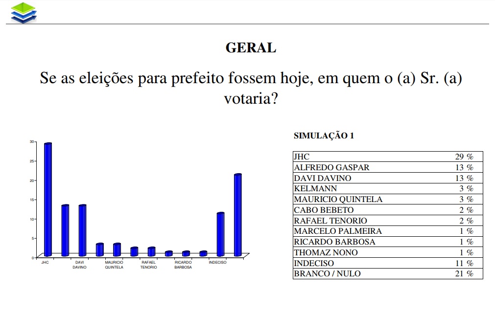 Na primeira simulação, o deputado federal JHC (PSDB) aparece como o mais votado com 29%, o procurador-geral de Justiça do Estado, Alfredo Gaspar de Mendonça, e o deputado estadual Davi Davino (PP), aparecem empatados como os segundos mais votados, com 13% cada um. Kelmann Vieira, Maurício Quintella, atual secretário de Infraestrutura do Estado, aparecem em seguida, com 3%;