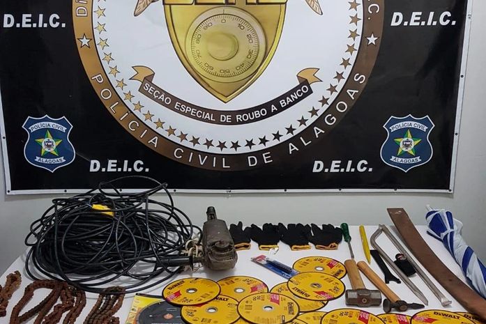 Também foram apreendidos discos de corte, instrumentos para arrombamento, martelos, luvas para não deixar digitais, pés de cabra, chaves de fenda, além de um guarda sol, que é utilizado para que os sensores, sensíveis ao calor humano, não captem a movimentação dos criminosos dentro da agência.