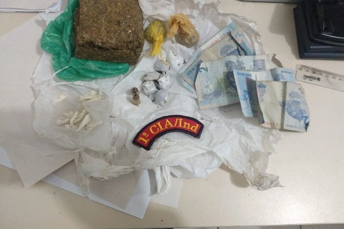 Em revista pessoal, foram encontrados com o jovem: 166g de maconha, cinco bombinhas da erva, 13 pedras de crack, duas munições de calibre ponto 380 e uma quantia de R$ 10,00, em dinheiro.