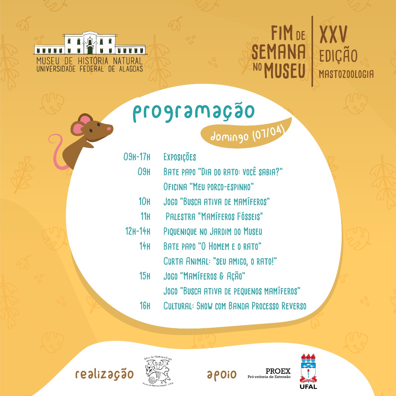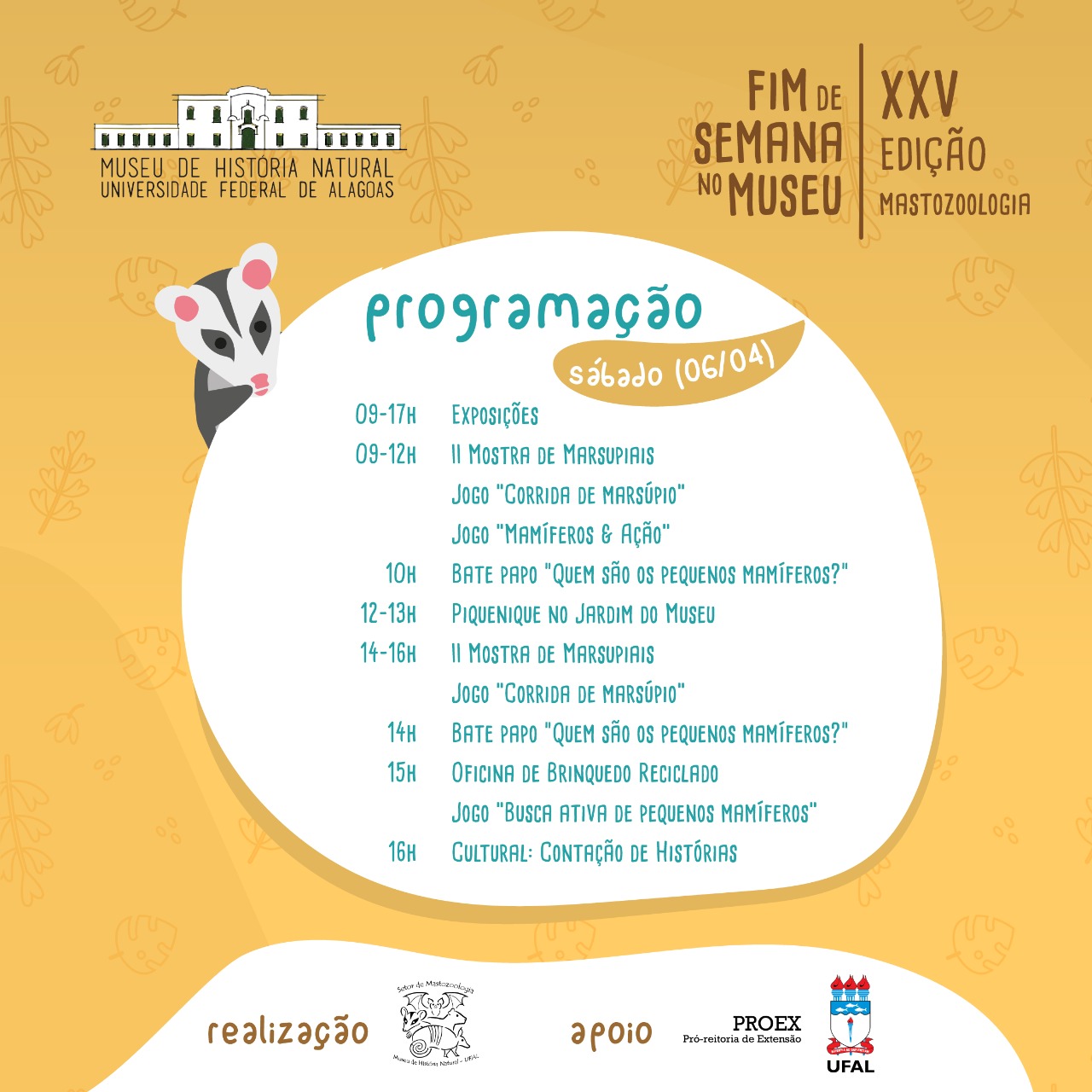 O Museu de História Natural (MHN) da Universidade Federal de Alagoas (Ufal) realiza a 25ª edição do tradicional Fim de Semana no Museu. Desta vez, o destaque serão os pequenos mamíferos, como roedores e marsupiais, que são animais com uma dobra de pele que origina uma espécie de bolsa. O evento acontece nos próximos sábado (6) e domingo (7), das 9h às 17h, na sede do MHN.