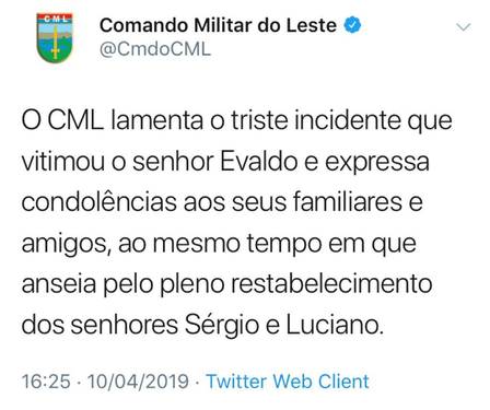 Durante a tarde desta quarta-feira, o Comando Militar do Leste postou, em seu perfil no Twitter, uma mensagem de condolências pela morte de Evaldo.
