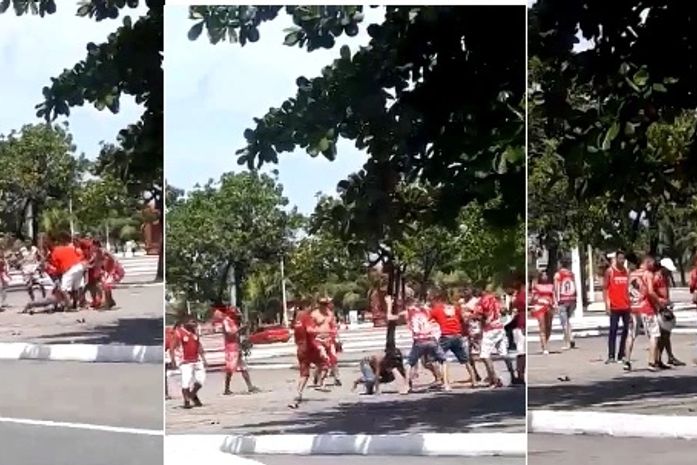 Pelas redes sociais, um vídeo compartilhado mostra o momento em que um homem é cercado por um grupo de torcedores do CRB, na Praça Marcílio Dias, no Jaraguá. O homem, que está de capacete e bermuda, está caído no chão e sendo fortemente espancado.