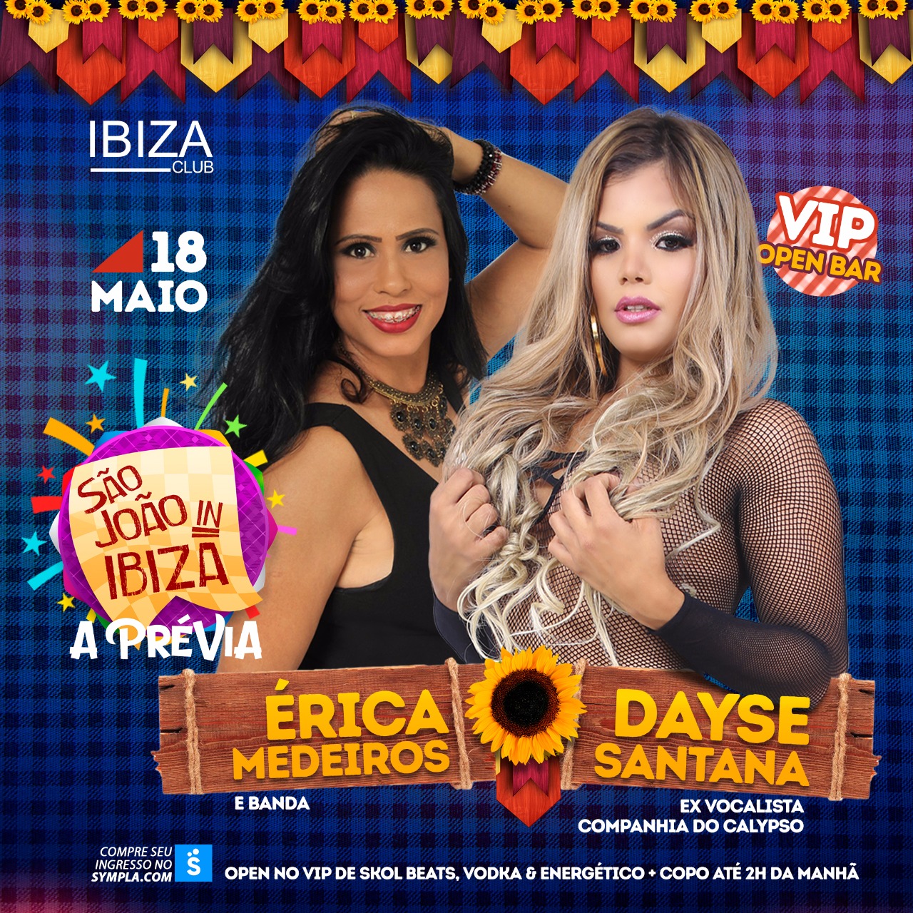 A ex-vocalista da banda Companhia do Calypso, Dayse Santana, vai agitar a noite deste sábado (18), na casa de show Ibiza Club, às 23h, no bairro do Jaraguá, em Maceió. A Cantora Érica Medeiros e mais dois DJs ainda devem agitar a prévia do São João da Ibiza. A festa conta ainda no espaço vip com open bar de Skol Bets até às 2h e vodka + energético durante toda noite.
