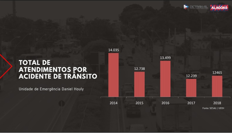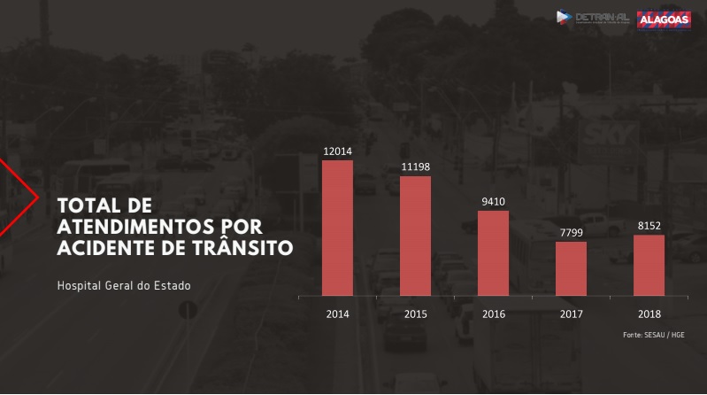 De 2014 a 2018 os atendimentos hospitalares de vítimas de acidente de trânsito apresentou uma redução de mais de 16 mil pacientes nas maiores unidades de emergência públicas do Estado. O dado integra a estatística do Departamento de Trânsito de Alagoas (Detran) sobre o número de acidentes ocorridos em Alagoas e dos atendimentos realizados no Hospital Geral do Estado (HGE) e no Hospital de Emergência do Agreste (UE), em Arapiraca.