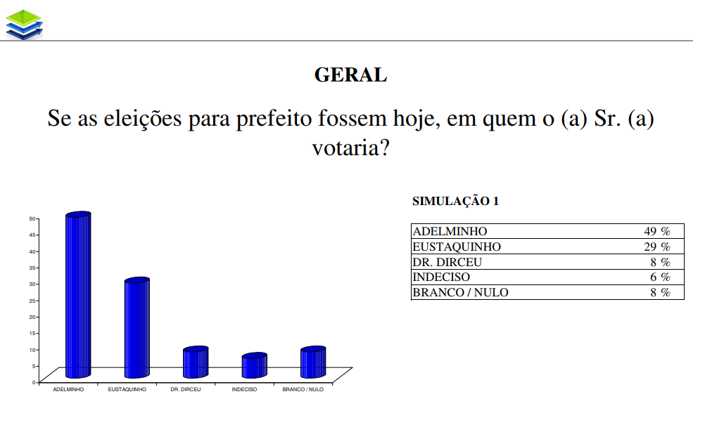 80% da população do município aprova a maneira como o prefeito vem realizando sua gestão na cidade. Com esse resultado, caso a eleição ocorresse hoje, Adelminho seria eleito com 49% da preferência do eleitorado.