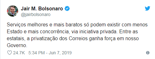 "Serviços melhores e mais baratos só podem existir com menos Estado e mais concorrência, via iniciativa privada. Entre as estatais, a privatização dos Correios ganha força em nosso Governo", tuitou.