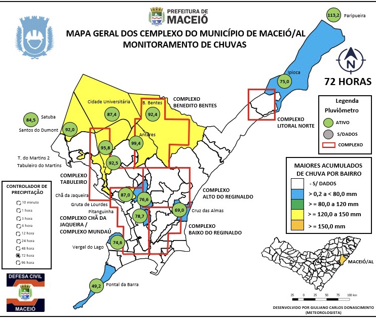O acumulado de chuva nas últimas 72 horas em Maceió registrou 99 mm no Posto Pluviométrico instalado no bairro do Antares, local onde houve maior concentração de chuva.