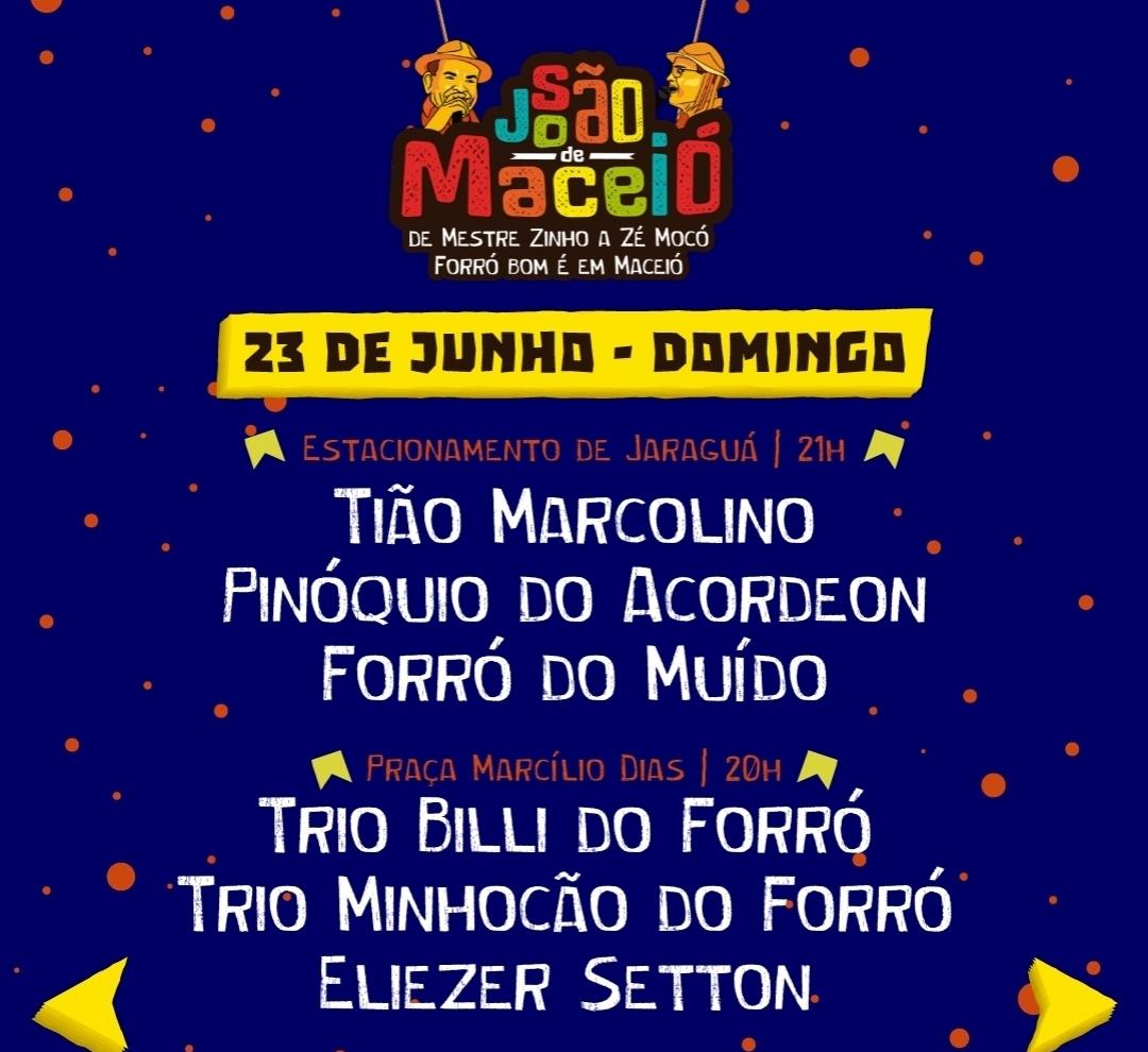 O São João de Maceió deve continuar animado na véspera de São João ao som da banda Forró do Muido. O show acontece no arraiá central, no bairro do Jaraguá e devem contar com outras atrações ao longo da noite.