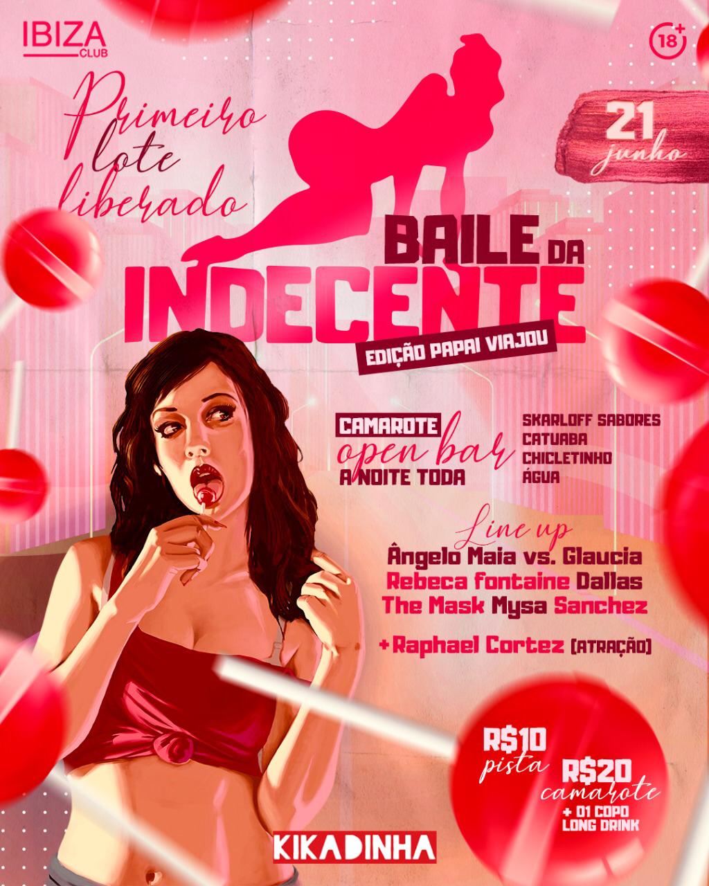 O baile da indecente vai agitar a noite desta sexta na casa de show Ibiza Club. O papai viajou e a gente preparou aquele camarote open bar que vai te animar a noite toda. A festa acontece a partir das 23h e os ingressos ainda podem ser adquiridos na bilheteria da casa.
