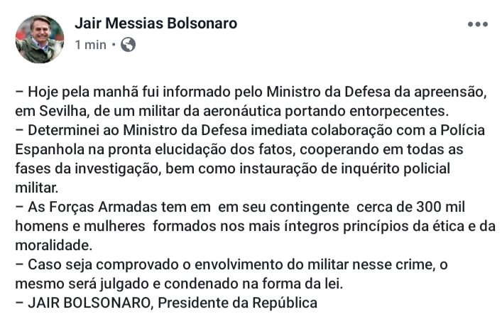 A prisão do sargento da FAB ocorreu durante uma escala do avião reserva da presidência em Sevilha, no sul da Espanha, rumo a Osaka, onde Bolsonaro participará da reunião do G-20. O ministério brasileiro de Defesa emitiu nota confirmando a detenção do militar por tráfico de entorpecentes, e anunciou a abertura de um inquérito para apurar o ocorrido. Bolsonaro também escreveu um tuíte sobre o fato.
