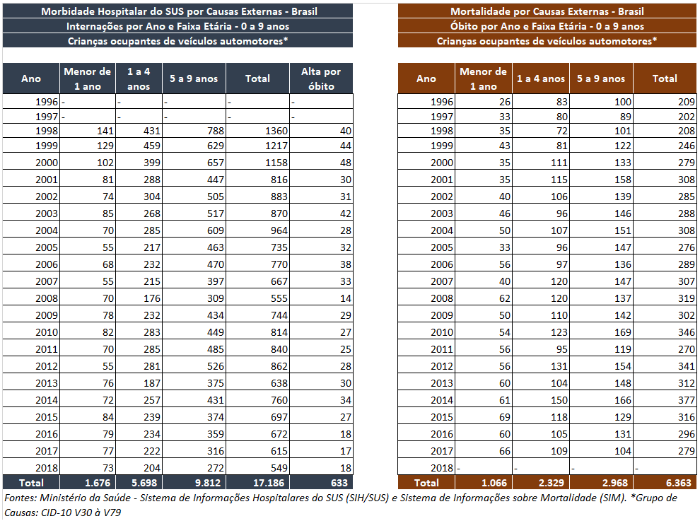 De 1996 a 2017, o Brasil registrou no total 6.363 óbitos de crianças menores de dez anos dentro de algum tipo de veículo automotor. Mais da metade desses casos (53%) envolviam crianças entre zero e quatro anos de idade. Segundo Luciana Rodrigues Silva, o uso desses dispositivos, quando usados corretamente, reduzem em até 70% o risco de morte em caso de colisão.