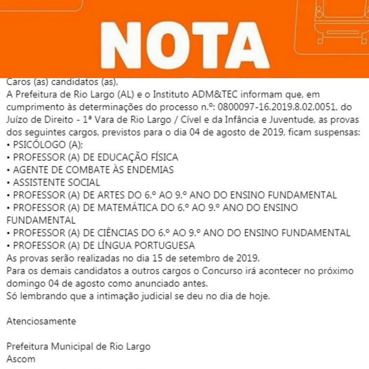 Em nota divulgada na tarde desta sexta-feira (2), a Prefeitura de Rio Largo anunciou a suspensão das provas de oito cargos no concurso marcado para o próximo domingo (4). Segundo o texto, publicado nas redes sociais oficiais da prefeitura, a decisão cumpre uma determinação da juíza Marcli Guimarães de Aguiar, da 1ª Vara Cível do município.