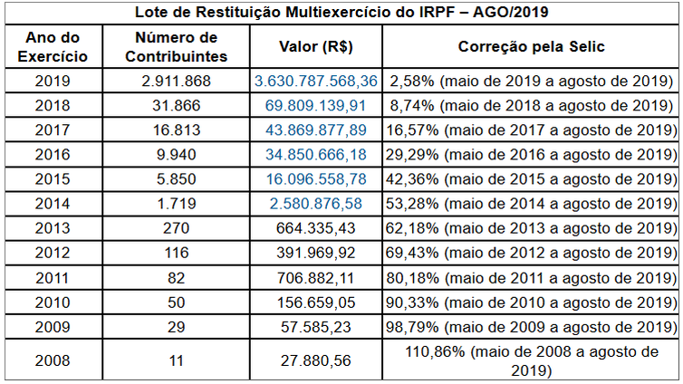 Os valores de restituição para cada exercício, e a respectiva taxa Selic aplicada como correção, podem ser acompanhados na tabela a seguir: