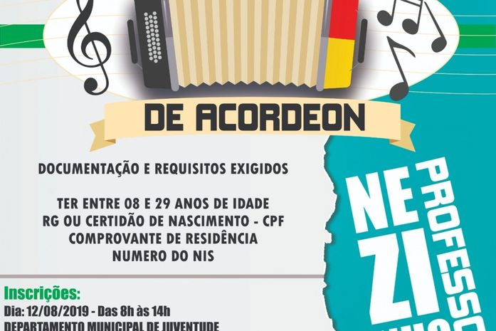 Estão abertas as inscrições para a Oficina de Acordeom, realizada pela Prefeitura de Delmiro Gouveia, através da Secretaria de Desenvolvimento Social, Infância e Juventude e do Departamento Municipal da Juventude.