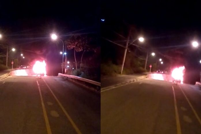 Um veículo pegou fogo depois que colidiu em um gelo baiano, na Avenida Pierre Chalita, na noite desta terça-feira (13). As imagens das chamas circularam nas redes sociais e chamaram atenção por conta da intensidade.