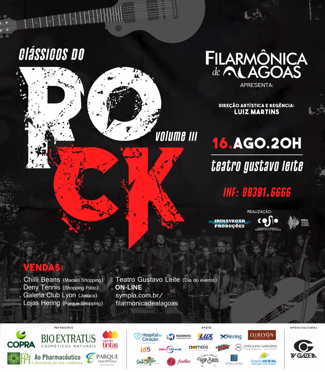 A Filarmônica de Alagoas retorna ao palco do Teatro Gustavo Leite com a terceira edição de um de seus maiores sucessos de público: o concerto Clássicos do Rock – Vol. III. Reconhecida pela crítica especializada, a série já foi tema até de matéria da revista nacional Rock Meeting, referência no assunto. A pedido do público, a Filarmônica apresenta agora uma nova seleção de clássicos do gênero musical, em um concerto ainda mais vibrante, com uma versão inédita de sucessos como Legião Urbana, Mutantes e Iron Maiden, dentre muitos outros.
