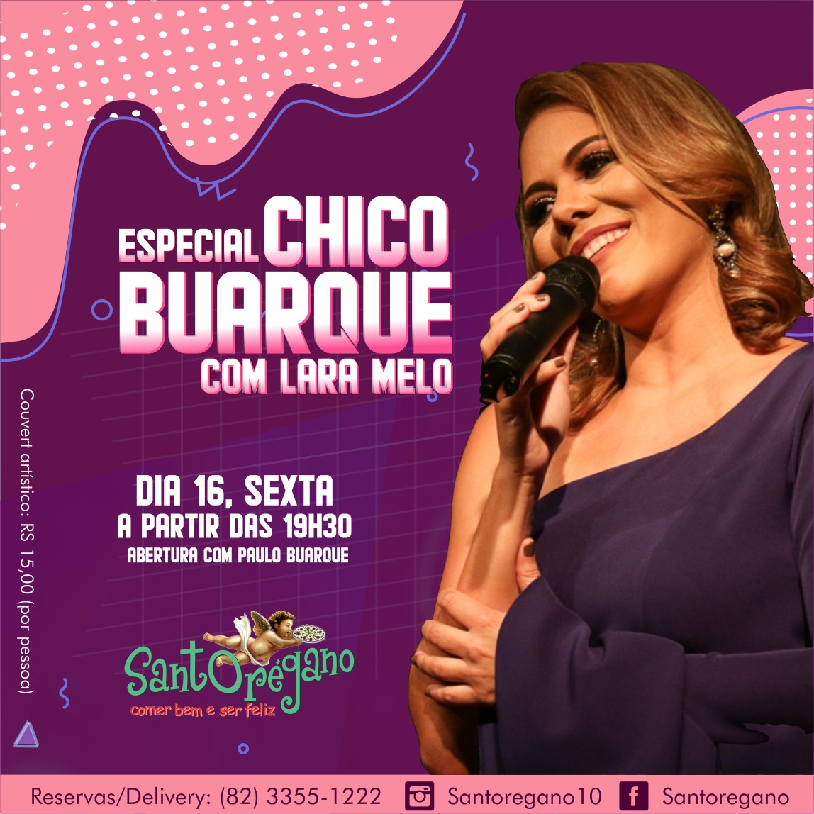 A partir das 19h30, a Pizzaria Santorégano apresenta um show mais que especial. A voz doce de Lara Melo interpretando uma seleção de clássicos do mestre Chico Buarque. Nesse espetáculo, o público contará também com a abertura musical de Paulo Buarque, trazendo as canções que tocam ao coração.