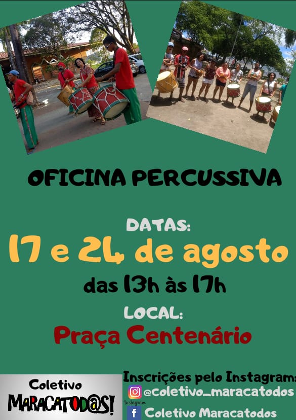 O Coletivo Maracatod@s realiza oficina percussiva nos próximos dias 17 e 24 de agosto das 13h as 17h na Praça Centenário. As tardes de sábado estarão mais vibrantes ao som dos tambores. As inscrições são gratuitas e podem ser feitas pelas páginas nas redes sociais. Instagram: @coletivo_maracatodos ou Facebook : Coletivo Maracatod@s.