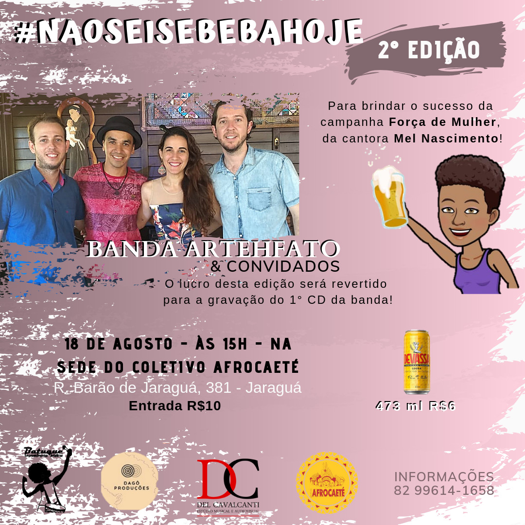 A segunda edição da Festa "Não Sei Se Beba Hoje" acontece neste domingo, 18, a partir das 15h na Sede do Coletivo Afro Caeté. A primeira edição teve o intuito de viabilizar a campanha do novo álbum da cantora Mel Nascimento. Foi um encontro com vários artistas e o lucro foi repassado para o Projeto Força de Mulher.