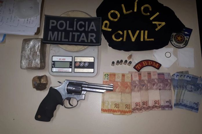 Junto com o suspeito, a polícia apreendeu cerca 245 gramas de maconha, uma balança de precisão, um revólver, cinco munições e uma quantia em dinheiro.