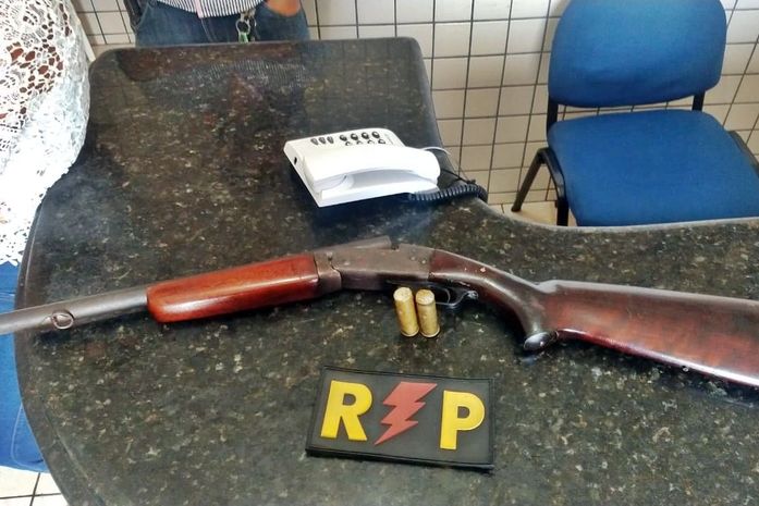 Durante a ação, os militares da guarnição Delta da Rádio Patrulha da 1ª Cia Independente, encontraram no estabelecimento comercial, uma espingarda calibre 12 municiada.