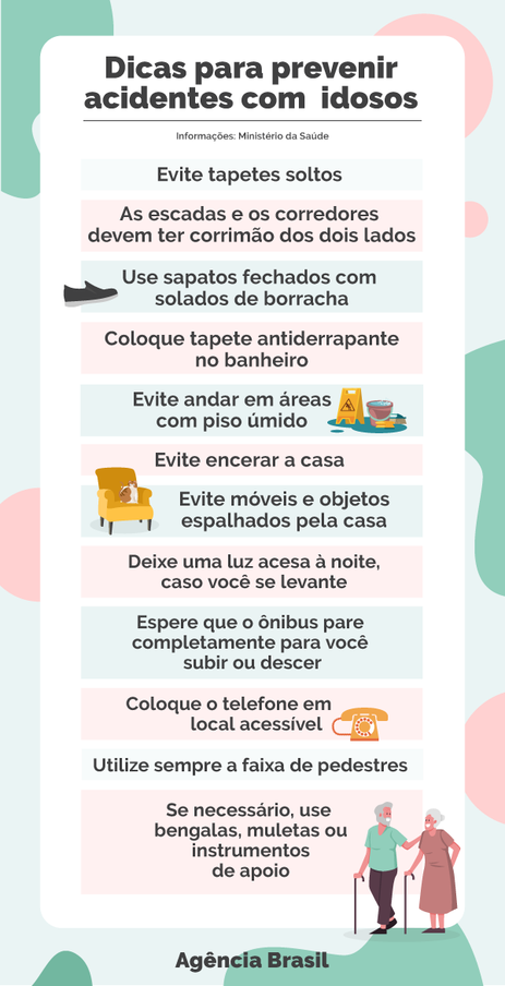 A fim de prevenir esse tipo de acidentes, que podem resultar em fraturas, traumatismo craniano, contusão muscular e, principalmente, o medo de cair novamente, o Ministério da Saúde listou uma série de dicas aos idosos.