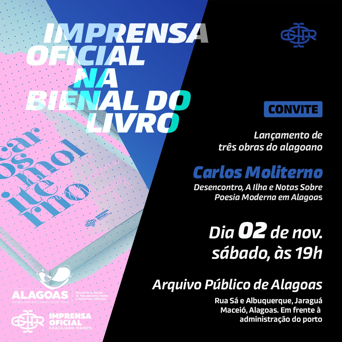 A obra completa do crítico e poeta alagoano Carlos Moliterno será lançada na noite do dia 2 de novembro. Depois de décadas de ausência, a Imprensa Oficial Graciliano Ramos trará novas edições de dois livros de poesia do autor, Desencontro e A Ilha e do ensaio literário Notas sobre poesia moderna de Alagoas.
