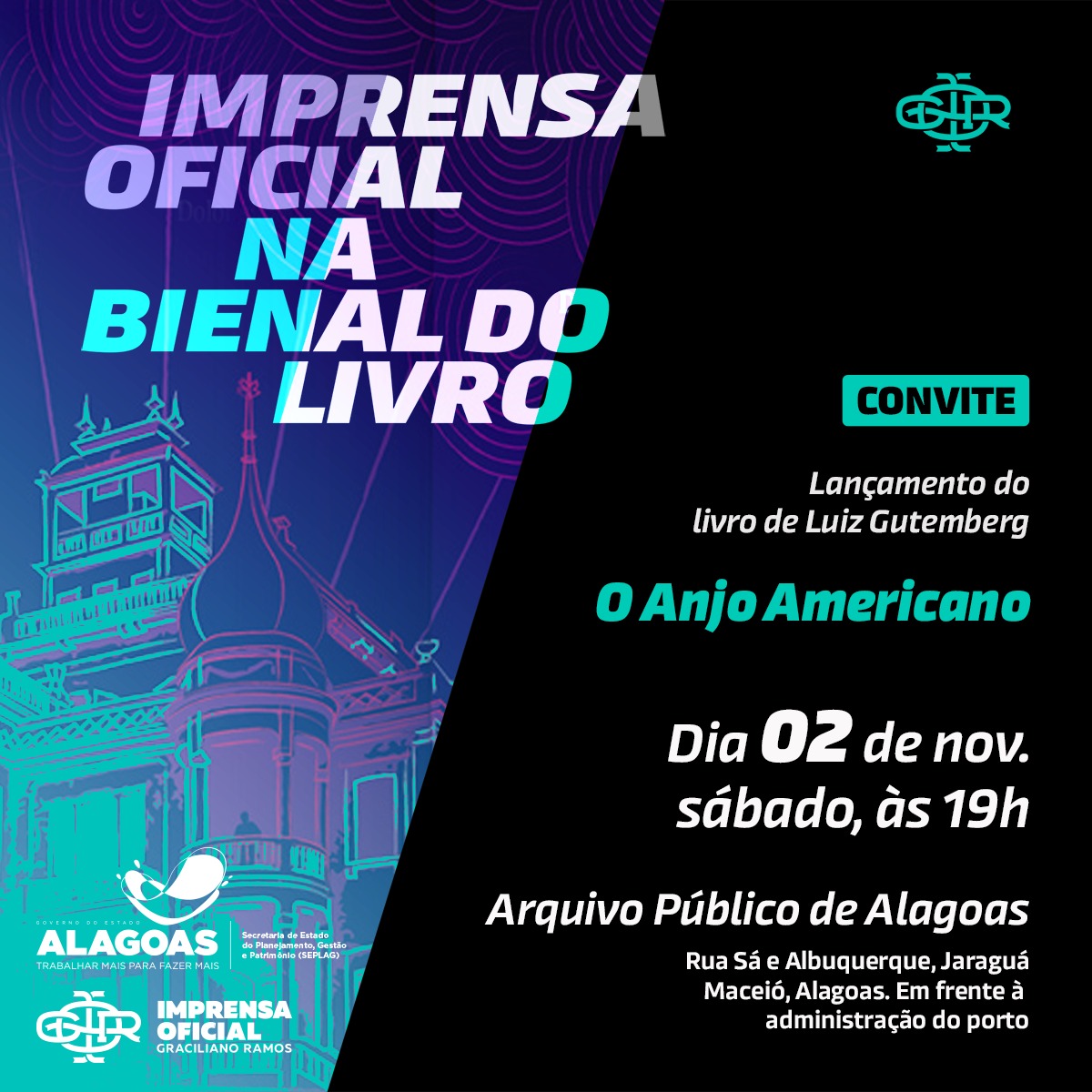 A partir das 19h, a Imprensa Oficial Graciliano Ramos lança a nova edição do romance O Anjo Americano, de jornalista Luiz Gutemberg. A obra que apresenta uma rica descrição da Maceió dos anos 1940, culmina numa contundente crítica política e comportamental da sociedade da época. Na noite de lançamento da segunda edição, o autor, que mora em Brasília, estará presente para a sessão de autógrafos.