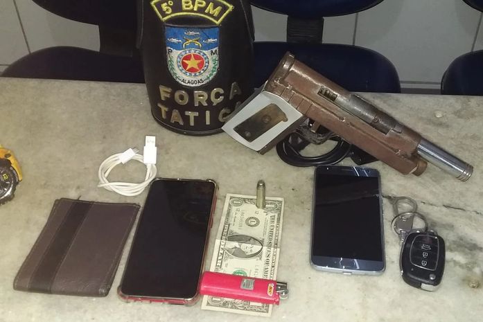 Uma pistola artesanal calibre 38, com munição, um celular e um carregador veicular foram apreendidos.