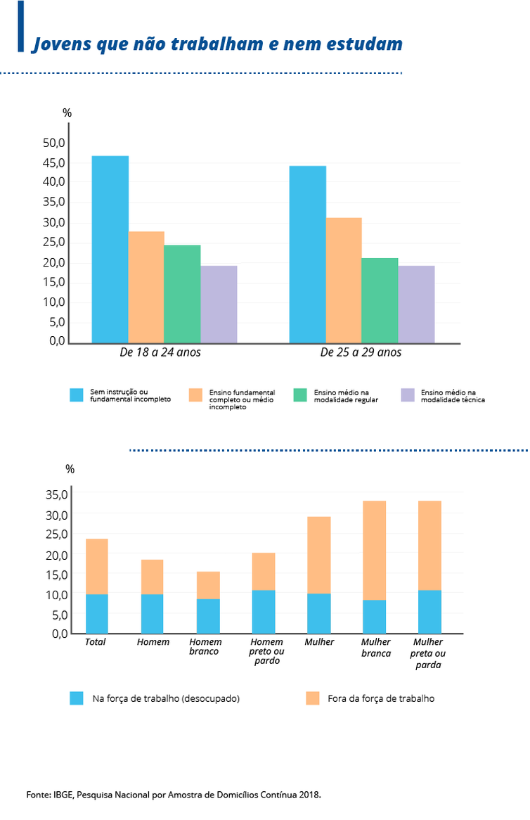 Entre os jovens de 18 e 24 anos, a incidência chega a 27,9% e nos jovens adultos, de 25 a 29 anos, a taxa de nem-nem é de 25,9%. Segundo o IBGE, o fenômeno é fortemente influenciado pela interrupção dos estudos. Os dados mostram que dos jovens de18 a 24 anos nessa condição, 46,6% não tinham concluído o ensino fundamental e 27,7% terminaram apenas essa etapa. Na faixa entre 25 e 29 anos, a proporção é de 44,1% e 31,2%, respectivamente. Dos jovens que concluíram o ensino médio, há mais nem-nem entre quem fez ensino regular do que entre os que concluíram o ensino técnico.