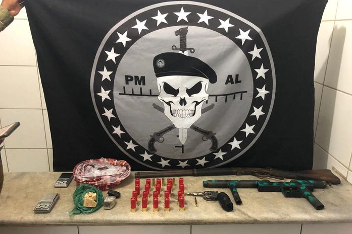 Também no local, os militares apreenderam: 0,040kg da droga ilícita maconha; 0,070kg de crack; 0,018kg de cocaína; duas balanças de precisão, sem marca definida; uma espingarda sem marca definida e calibre indefinido; uma arma de fabricação caseira calibre 12; um revólver calibre 22, marca Rossi, sem numeração definida; três munições calibre 22; cinco munições calibre 44; vinte munições calibre 12.