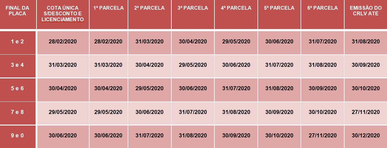 Cada final de placa possui uma data-limite para pagamento da cota única sem desconto ou da primeira parcela. As placas de finais 1 e 2 têm até 28 de fevereiro; placas de finais 3 e 4 até 31 de março; placas de finais 5 e 6 até 30 de abril; placas de finais 7 e 8 até 29 de maio e as placas de finais 9 e 0 até 30 de junho. O valor mínimo de cada parcela – que pode ser dividida em até seis vezes – não poderá ser inferior a R$ 100.