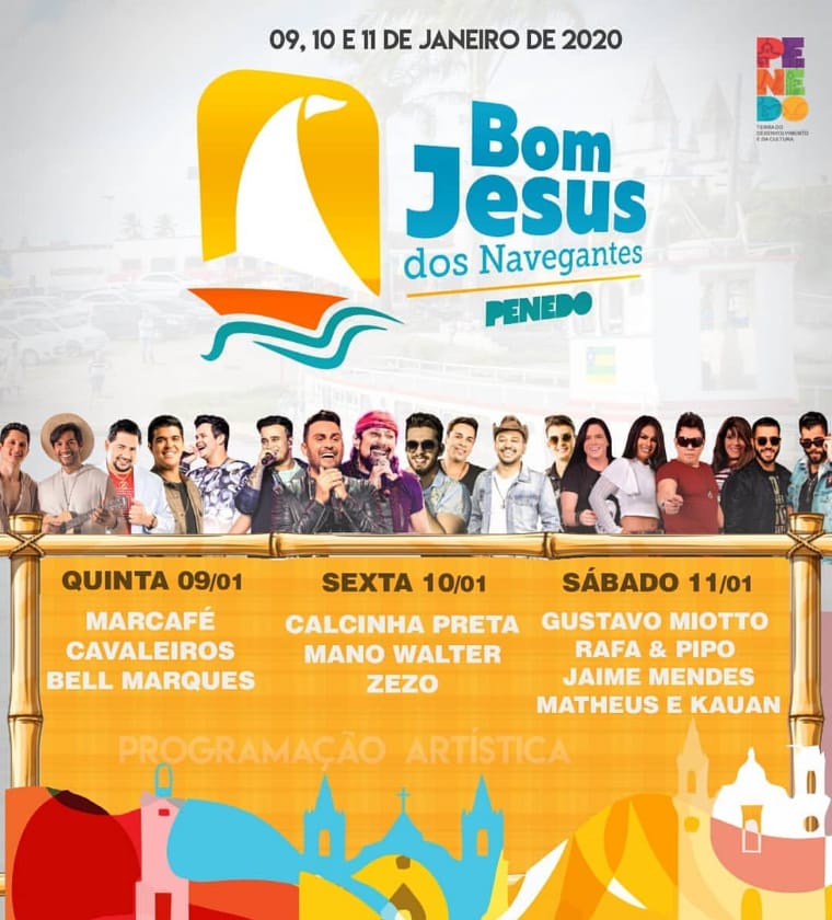 A programação festiva do Bom Jesus dos Navegantes de Penedo começa logo mais à noite, com Jaime Mendes, seguido por Gustavo Miotto, fechando com as duplas Rafa e Pipo (filhos de Bell Marques) e Matheus e Kauan.