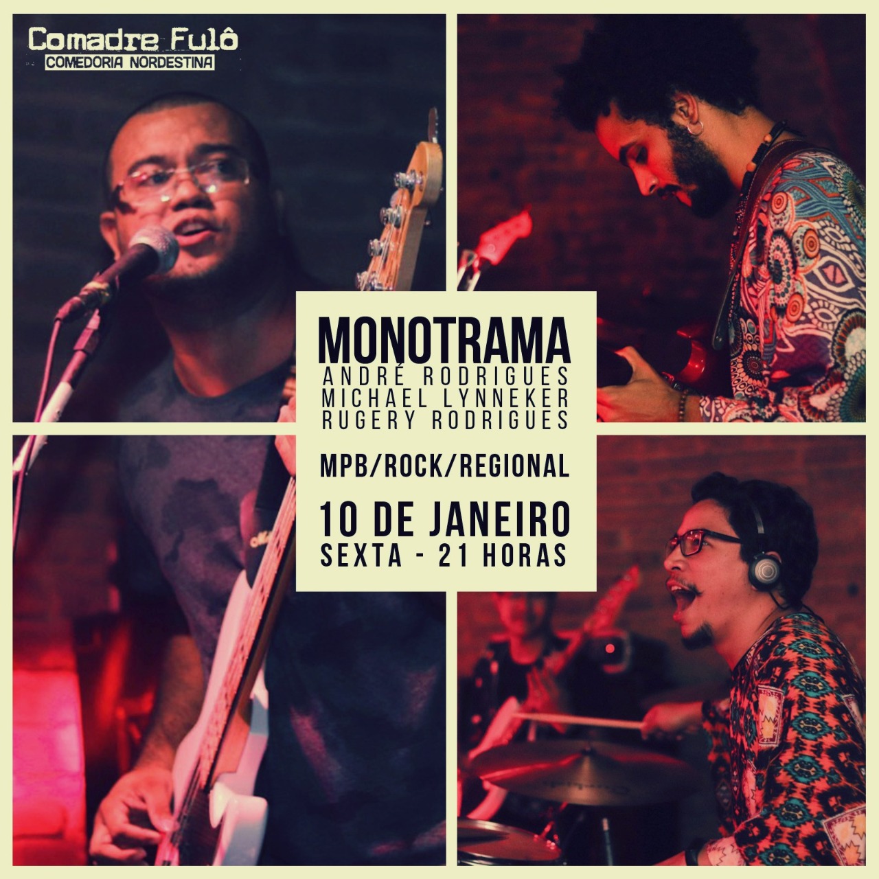 Os alagoanos da banda Monotrama trazem para a Comadre Fulô, um show imperdível nesta sexta-feira (10). O show começará a partir das 21h, com um repertório diversificado pra você que gosta de Los Hermanos, Novos Baianos, Caetano, Barão, entre outros. Uma mistura completa pra deixar todo mundo afetado.