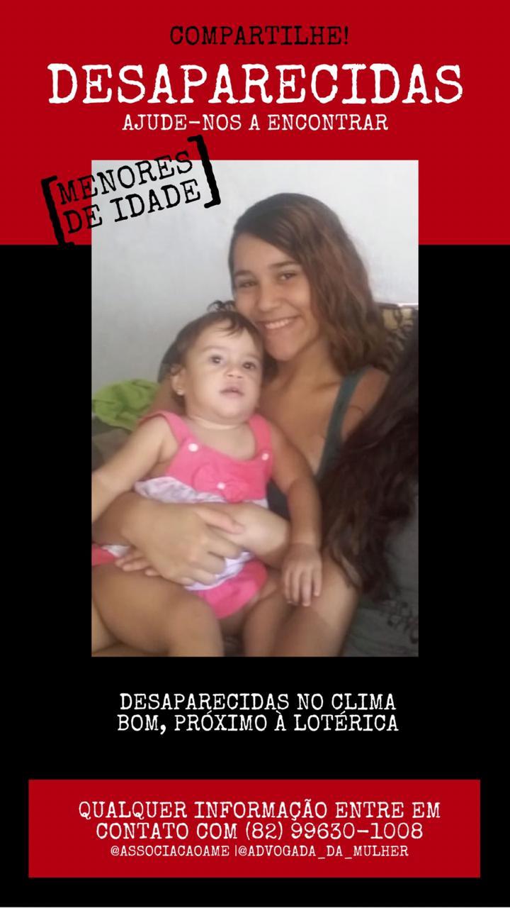 Uma adolescente de 14 anos e a filha de menos de um ano estão desaparecidas em Maceió desde terça-feira (21). Segundo informações da advogada e presidente da Associação Para Mulheres (AME), Júlia Nunes, na segunda-feira (20), os vizinhos denunciaram que a adolescente foi vítima de agressão pelo companheiro. A presidente da Associação e a família estão pedindo ajuda para localizá-las.