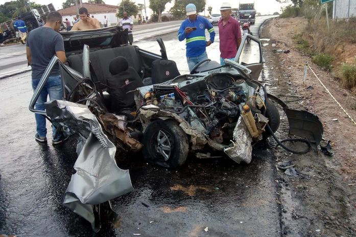 Com o impacto, o carro de passeio ficou completamente destruído e o caminhão de frutas tombou ao lado da pista.